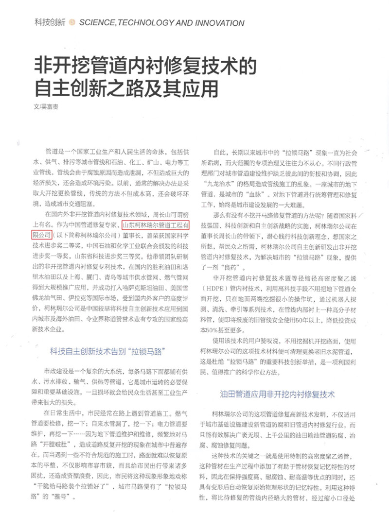 非開挖管道內襯修復技術的自主創新之路及其應用